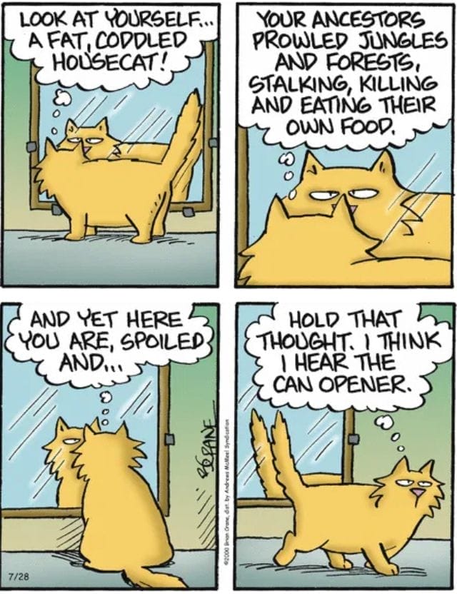 This comic’s cat ponders its wild ancestry, only to be distracted by the sound of a can opener. Family humor at its best: equal parts self-reflection and snack motivation.