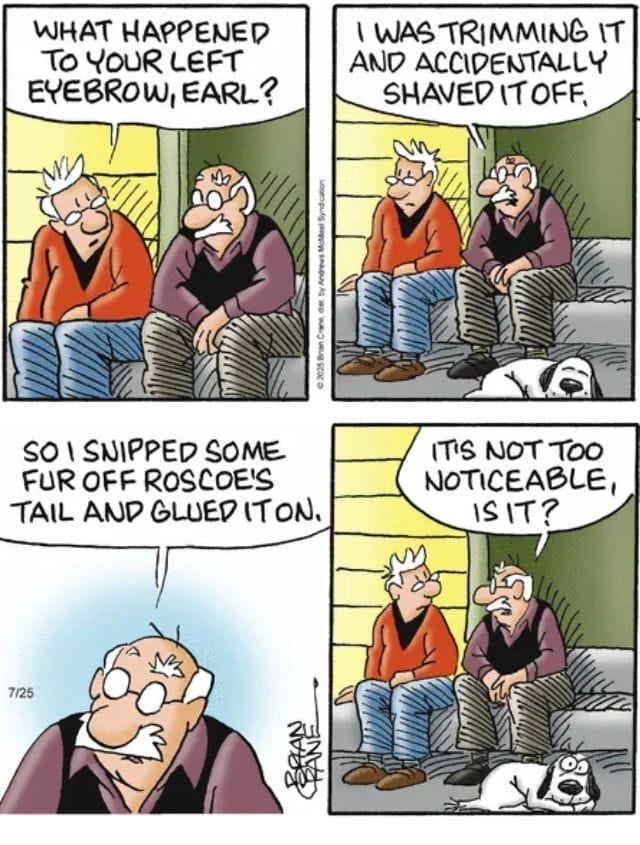 What happens when you shave off an eyebrow by accident? If you’re Earl, you raid the dog’s tail for a replacement. The lengths people go for a little dignity is proof that daily family humor never runs out of material.