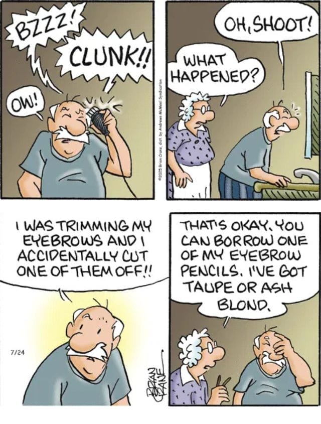 Trimming eyebrows is risky business in this house! After an accidental eyebrow mishap, Opal saves the day with an arsenal of eyebrow pencils in “taupe or ash blond.” If your family’s daily humor involves beauty fails and quick fixes, you’ll see yourself in this strip. Only in daily family humor can a missing eyebrow turn into a full family event!