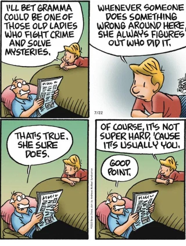 If anyone in your family is always “solving” household mysteries, this one’s for you. Nelson imagines Gramma as a crime-solving superhero, but the real joke is she always figures out who did it—because, let’s face it, it’s usually Nelson. Daily family humor: exposing household “crimes” since forever.
