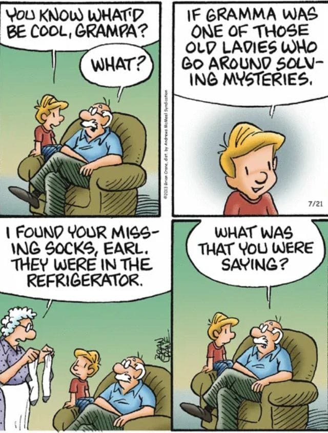 Ever find your socks in the fridge? In this comic, even Gramma’s detective skills can’t explain everything that happens in a family home. Sometimes, you just have to laugh (and buy new socks).