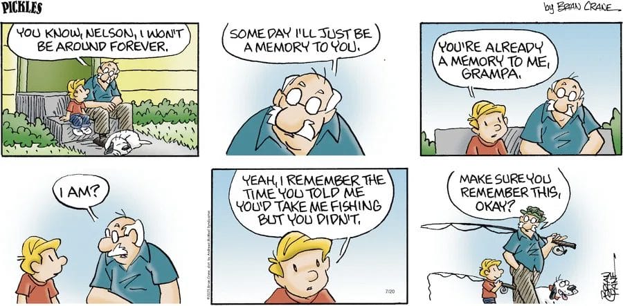 A touching moment turns funny when Grampa realizes he’s already a “memory” for his grandson—mainly because of that one time he promised fishing and forgot. A sweet reminder to make good on those family plans!
