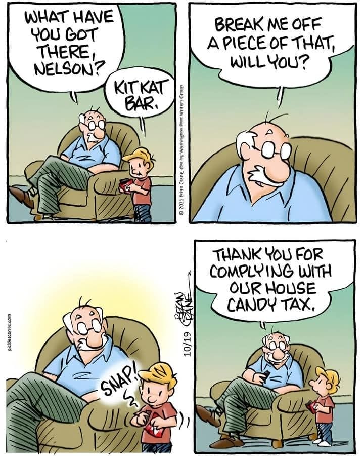 Forget the IRS—every home has its own “candy tax.” When Grandpa claims his mandatory Kit Kat bar cut, it’s a reminder that grown-ups will always get their share (especially when chocolate is involved). Classic family comedy.