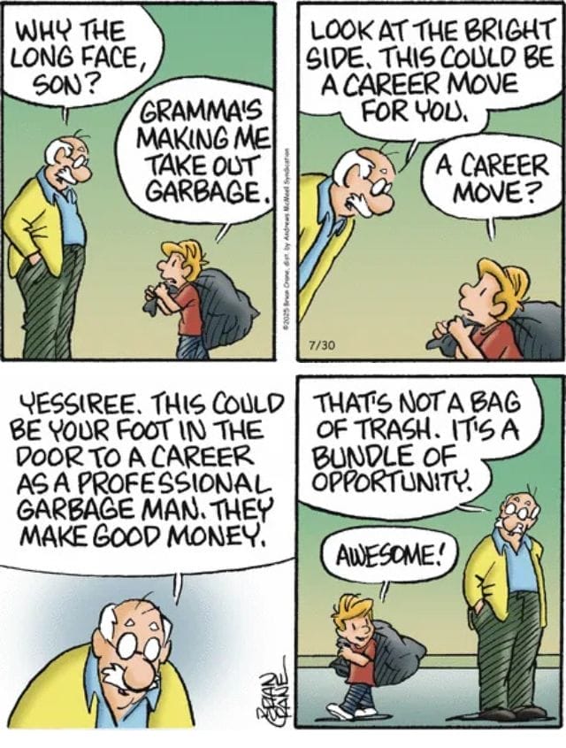 Turning chores into life lessons, one bag of trash at a time. Grandpa reframes taking out the garbage as “a bundle of opportunity,” proving that daily family humor can turn even chores into comic gold.