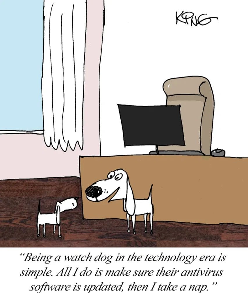 Modern security means having a watchdog who updates your antivirus, then naps on the job. This daily gag cartoon pokes fun at our digital lives and the “protection” we depend on—even when it’s all bark and snooze.
