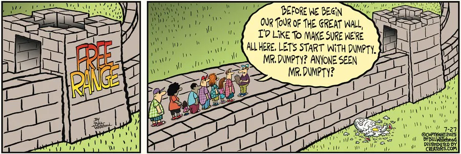 Tour guide check-in goes awry when “Mr. Dumpty” is MIA… and his remains are in a heap by the wall. It’s irreverent, clever, and perfectly captures the spirit of daily humor comics—where even classic nursery rhymes get a grown-up twist.