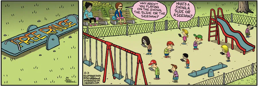 What happens when kids can’t recognize playground equipment? You get a park full of kids glued to screens and no clue what a seesaw is. Modern life, perfectly skewered.