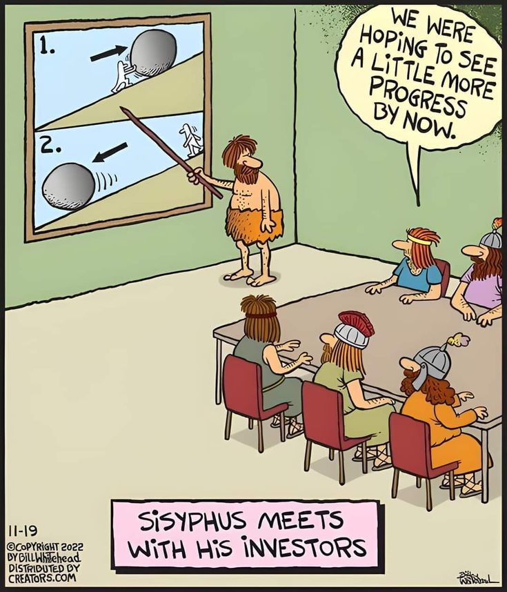 Mythology meets modern startup life as Sisyphus reports to his “investors.” Hilarious proof that some projects just keep rolling the wrong way.