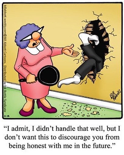 Sometimes telling the truth earns you a frying pan to the head. This cartoon exaggerates married life arguments to absurd perfection.