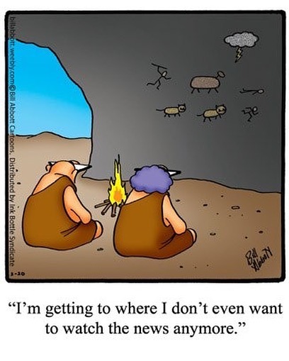 Even cavemen got tired of bad news. This prehistoric gag is both timely and timeless—a clever jab at modern media burnout.
