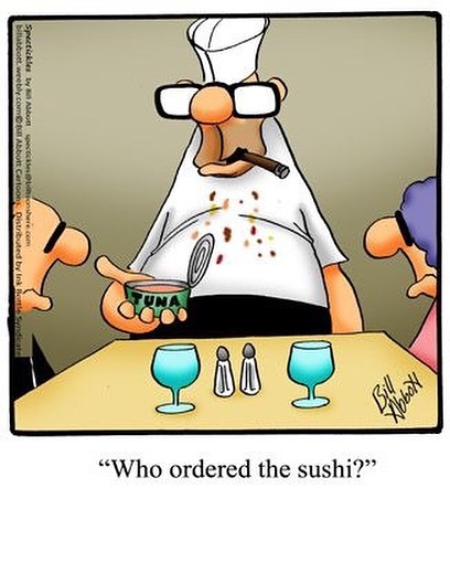 Nothing says “fine dining” like a chef with a tuna can and a cigar. A sarcastic dig at questionable restaurant experiences.