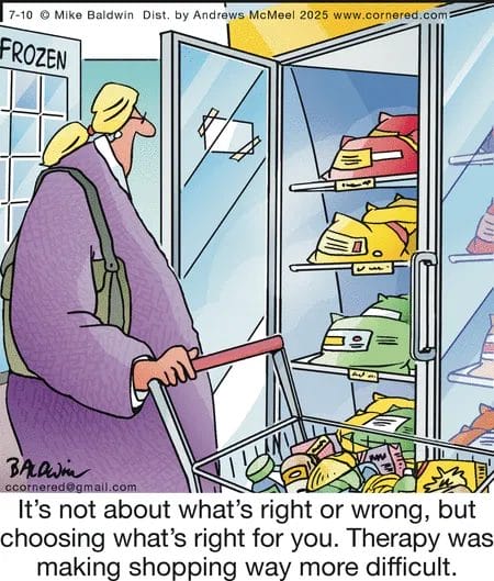 Therapy has made grocery shopping a quest for personal truth: “It’s not about what’s right or wrong, but what’s right for you.” This comic gently mocks how self-help trends sneak into the most mundane moments—like choosing between frozen peas and pizza.