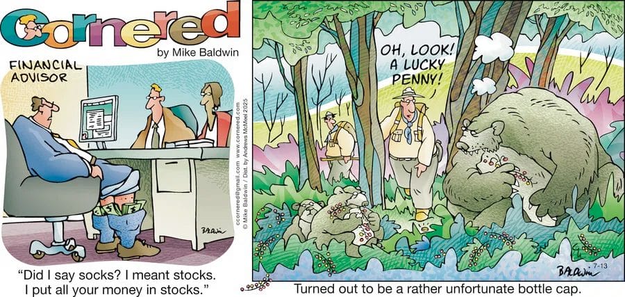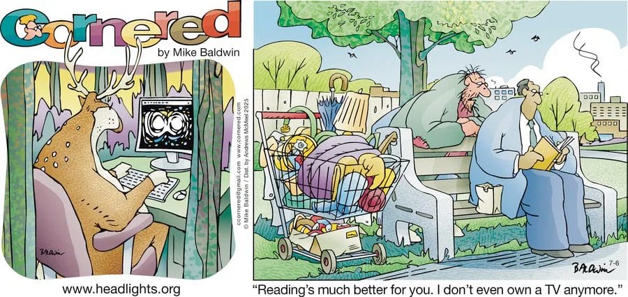 All comics reviewed are the creative work of Mike Baldwin, creator of the long-running syndicated comic “Cornered.” To see more of his humor, visit the official GoComics Cornered page, where new strips are posted regularly.