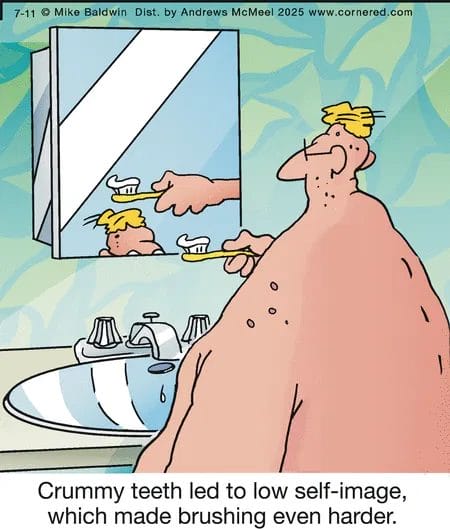Crummy teeth, low self-image, and the endless battle at the bathroom sink. Baldwin takes a mundane moment and transforms it into relatable cartoon gold.