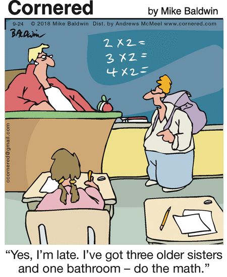 “Three older sisters, one bathroom—do the math.” Relatable cartoons don’t get more universal than the morning sibling scramble. Math class just got a whole lot more real.