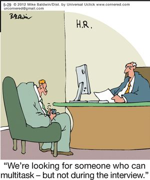 The perfect multitasker—except during the interview. Baldwin’s wit cuts through workplace expectations, lampooning that impossible demand to “do it all” but also “just sit there and focus.”