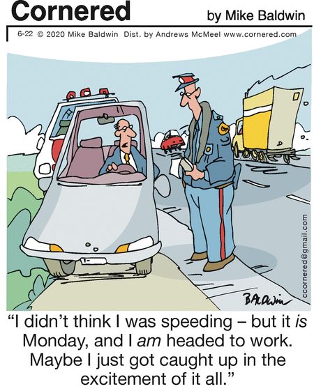 Speeding on a Monday morning? The only crime here is being late to work (and maybe creative storytelling). A relatable cartoon for every commuter whose week starts with a minor meltdown.
