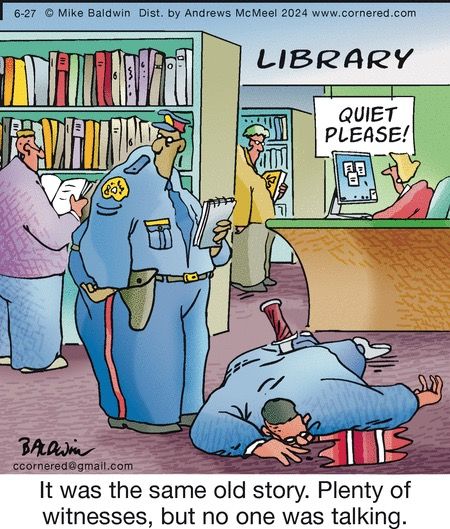 A classic whodunit: a crime in the library with plenty of witnesses, but “no one was talking.” It’s equal parts crime drama parody and bookish hilarity.