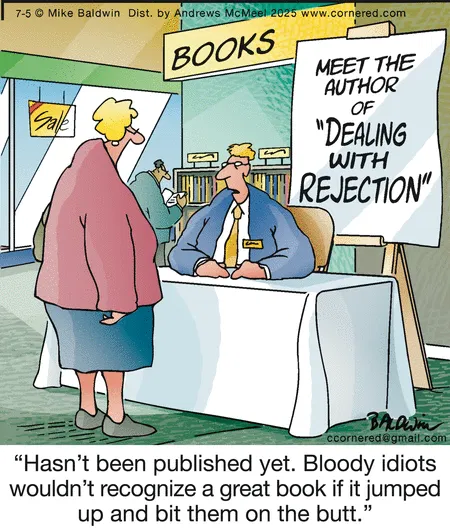 “Hasn’t been published yet. Bloody idiots…” This author’s signing event is the comic version of a roast. If you’ve ever put your work out there, this punchline hurts so good.