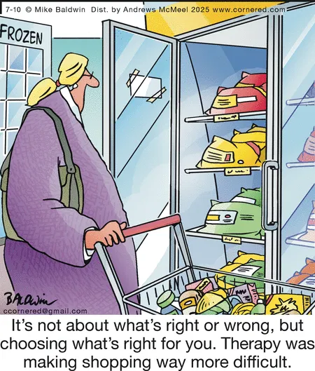 Therapy has made grocery shopping a quest for personal truth: “It’s not about what’s right or wrong, but what’s right for you.” This comic gently mocks how self-help trends sneak into the most mundane moments—like choosing between frozen peas and pizza.