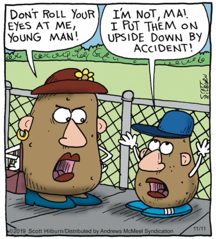 “Don’t roll your eyes at me” takes on new meaning when you’re literally a potato. Bonus laughs for the upside-down placement excuse. Mr. Potato Head drama at its best.