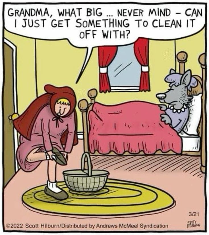 Little Red Riding Hood has questions—but mostly hygiene ones. This cartoon takes fairytale tropes and gives them a deliciously awkward modern twist.