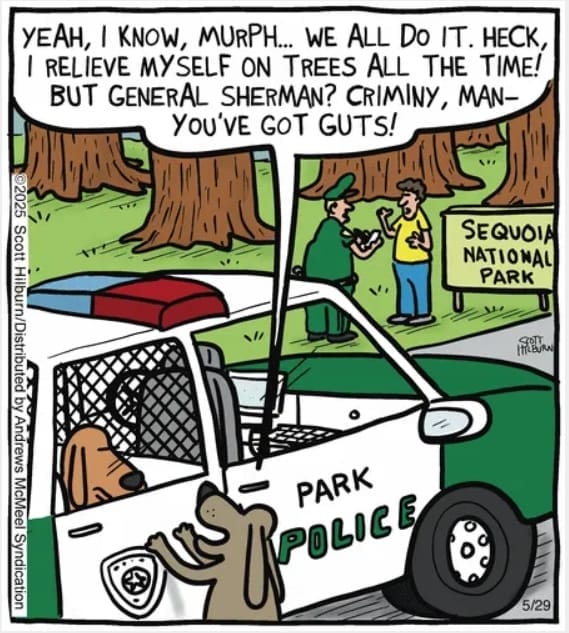 Dogs marking trees? Normal. Doing it on General Sherman? Criminally bold. Hilburn’s park-themed comic hits the sweet spot between toilet humor and historical reverence.