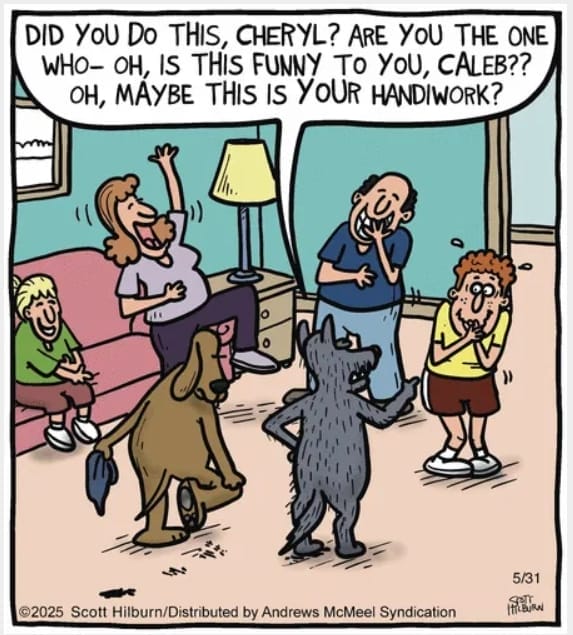 When everyone blames each other for a mess and the dog’s wearing a sock like a trophy, you know you’ve got a guilty paw. Relatable family humor, sealed with a tail wag.