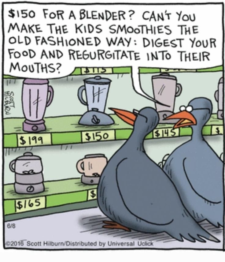 Pigeons balk at $150 blenders, and honestly, same. Why blend when you can regurgitate the old-fashioned way? Evolutionary parenting at its finest.