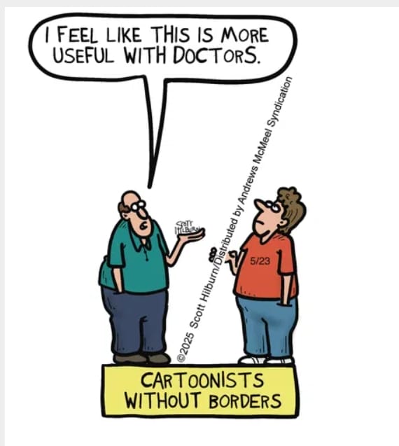 Two cartoonists, one pun: this one’s for the meta lovers. The punchline? It’s only really useful with doctors. Dry, droll, and exactly what cartoon humor should be.