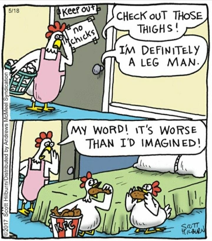 Leg man jokes reach poultry horror levels when a hen walks in on roommates munching KFC. The expressions sell it. Nightmare fuel, but make it funny.
