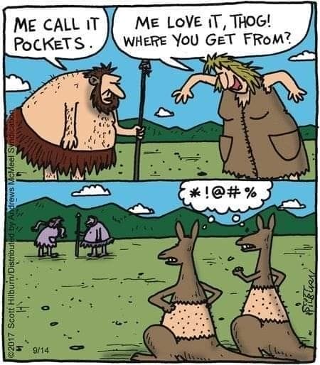 Ever wonder who invented pockets? Apparently, it’s cavemen stealing from kangaroos. The comic’s blend of invention history and marsupial rage is hilariously absurd.