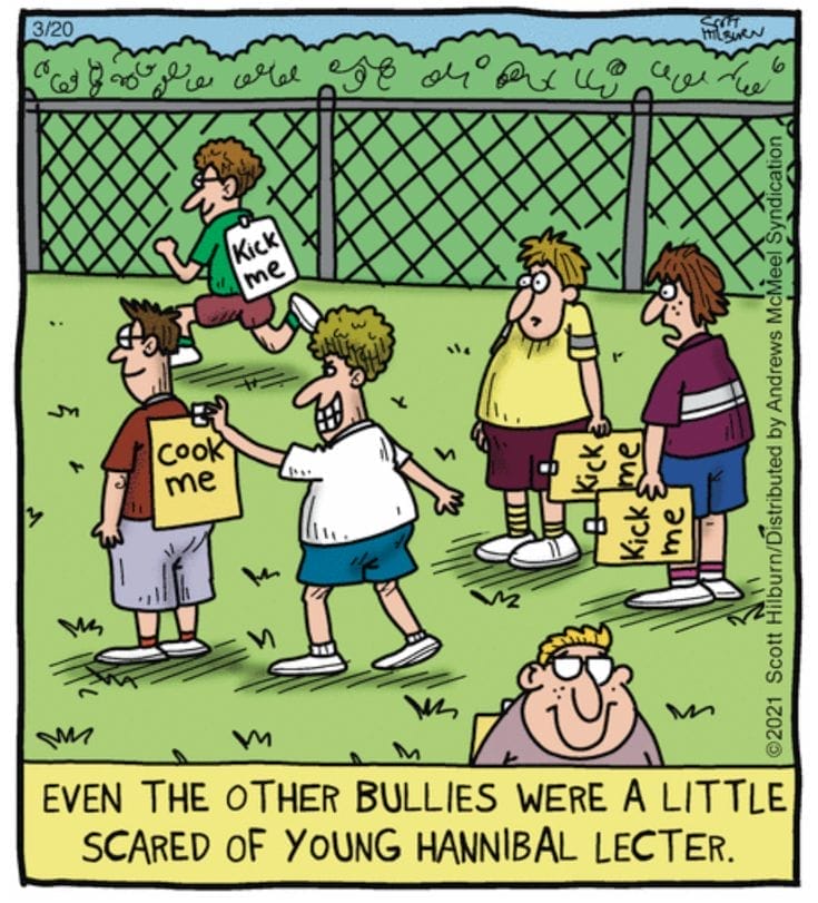 Most kids play tag. Young Hannibal Lecter tapes “Cook Me” signs to other kids’ backs. The mix of horror and childhood innocence is deeply unsettling—and deeply funny.