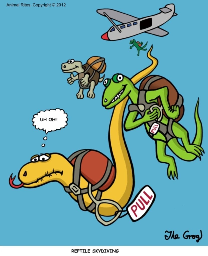 Reptiles are skydiving. All is well until we see the snake, whose “PULL” cord is impossible to reach. Its horrified “uh oh!” says it all. This is pure slapstick layered with the kind of helpless horror that defines dark humor.