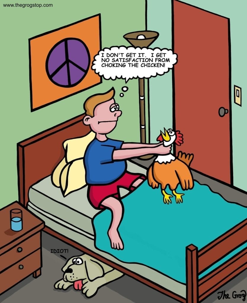 A guy wonders why “choking the chicken” doesn’t feel good—because, well, he’s literally choking a chicken. Meanwhile, his dog mutters “IDIOT” from under the bed. Grog masterfully plays dumb behavior for laughs, turning innuendo into innocent lunacy.