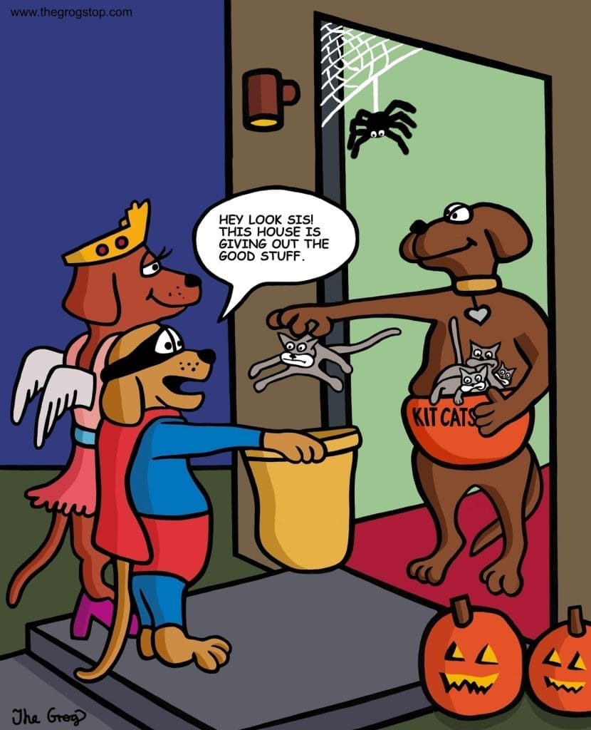 This Halloween comic takes dog logic to the next level. Two pups in costume are thrilled to get “Kit Cats”—actual cats. One’s even mid-screech as it’s dropped in the bag. Absurdity level: expert. Halloween humor at its weirdest and most wonderful.