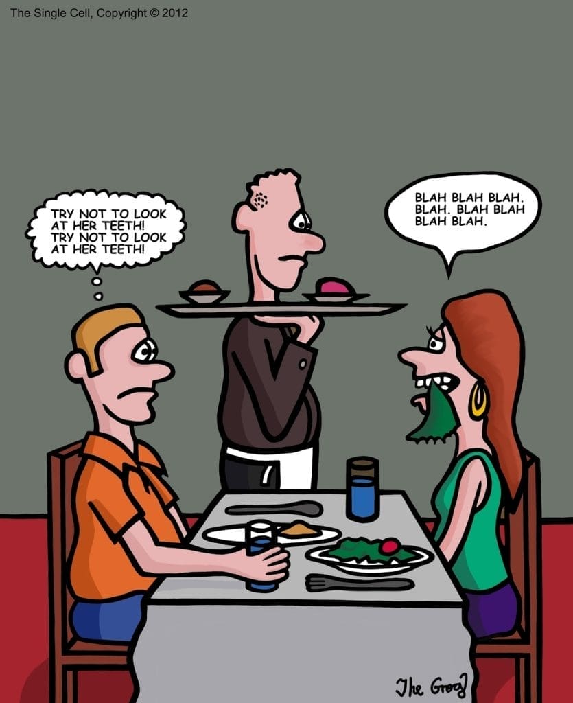 Dating disasters strike again. A guy tries not to stare at the forest of spinach between his date’s teeth, while she rambles on blissfully unaware. We’ve all been there (hopefully not that bad), and the tension is cartoon gold. Social horror meets deep humor here.