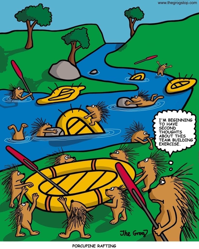 Team-building exercises are dangerous. Add porcupines and inflatables? Catastrophic. This cartoon delivers pure physical comedy and a spiky metaphor for poorly planned corporate bonding. It hurts just looking at it—and that’s what makes it brilliant.