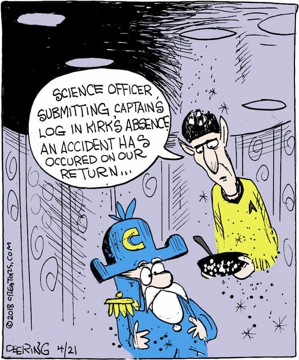 Spock’s expression says it all — even the most advanced ships aren’t immune to workplace accidents. Star Trek meets bureaucratic comedy.