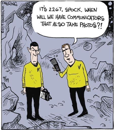It’s 2267, and Kirk just wants a communicator that takes selfies. Deering skewers our obsession with gadgets by fast-forwarding tech anxiety.