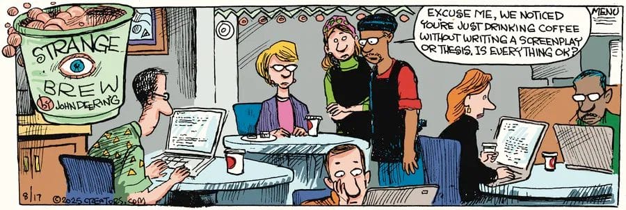 Credit All comics reviewed are by John Deering, creator of Strange Brew. You can find more of his work on GoComics. His style — sharp, surreal, and unapologetically witty — makes him a standout voice in modern cartooning.