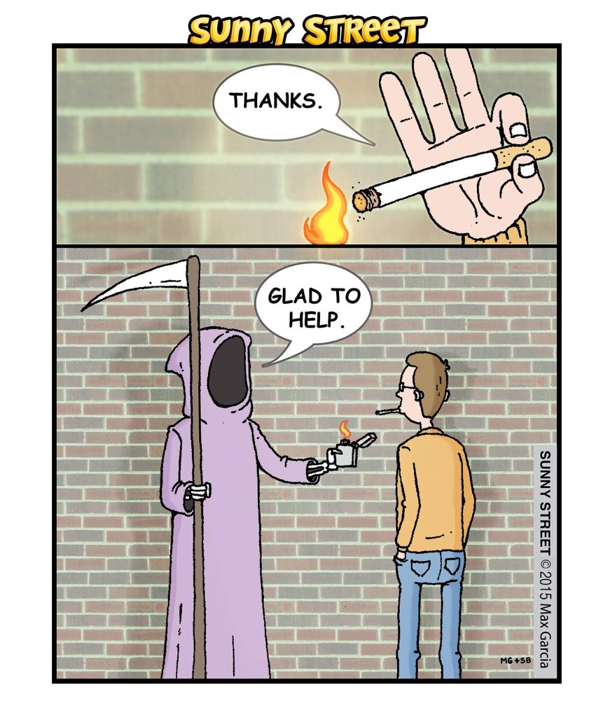 Need a light? Death’s got you covered. This dark gem shows the Grim Reaper helping someone light a cigarette, complete with a cheery “Glad to help.” The irony is so thick, you could slice it with a scythe.