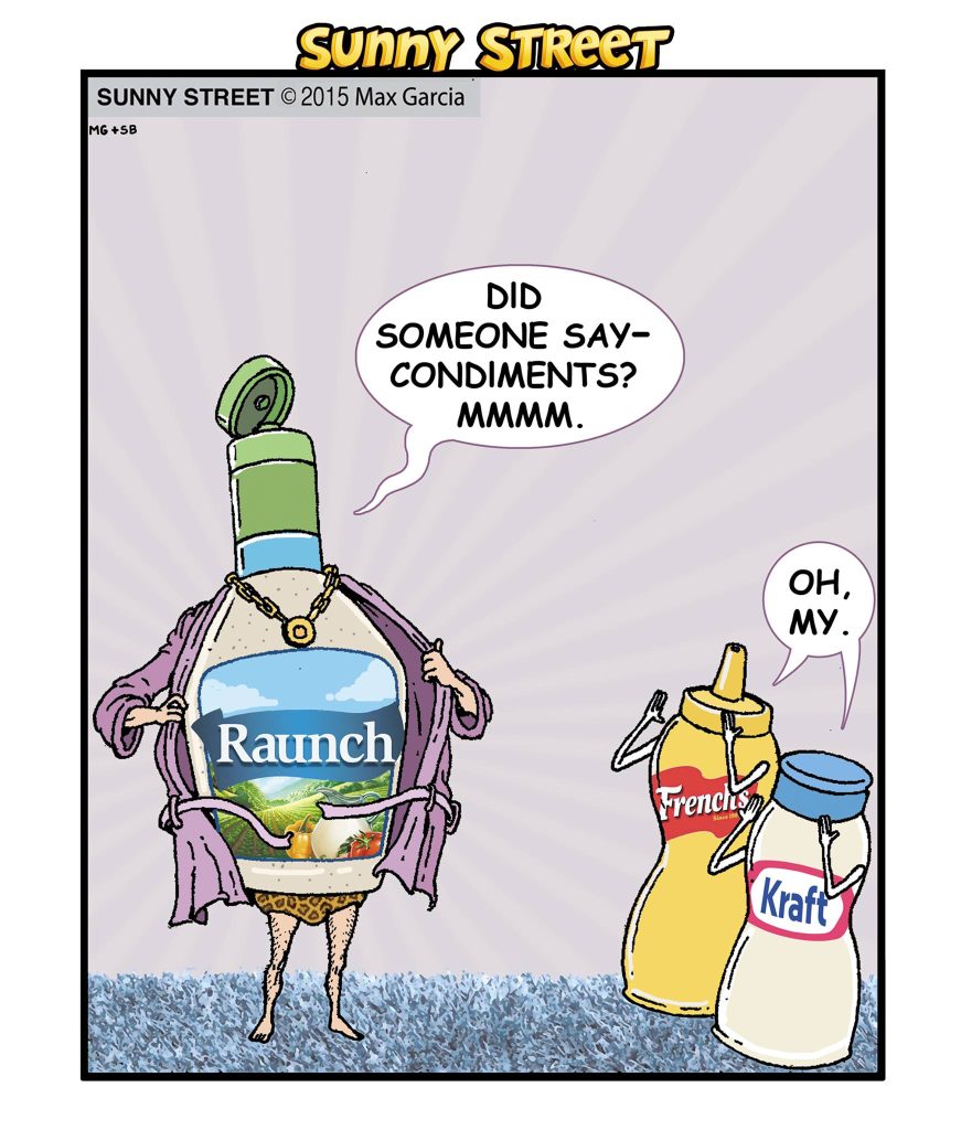 “Did someone say condiments?” asks a ranch dressing bottle… who’s exposing himself to mustard and mayo. This comic is pun-heavy, slightly NSFW, and irresistibly ridiculous.