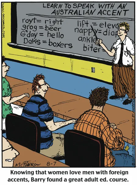 Barry figures a foreign accent will impress women. Let’s just say “ankle biter” doesn’t scream smooth operator.