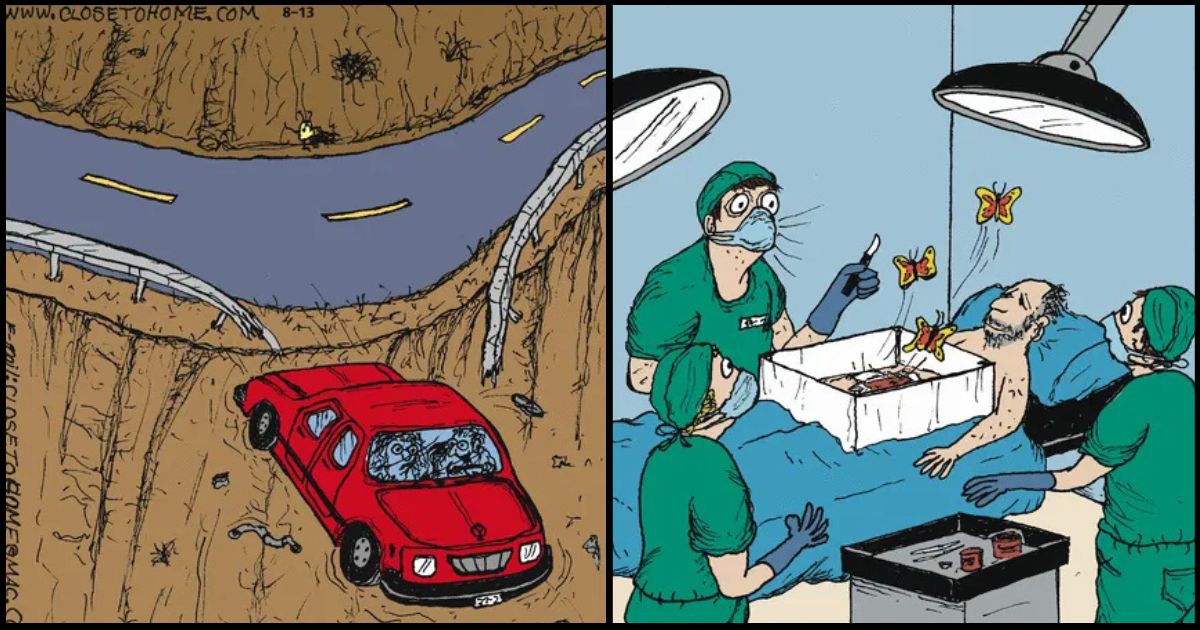 These 20 dark humor cartoons prove that John McPherson’s Close to Home thrives on taking the ordinary and twisting it into something outrageously funny. From awkward parenting moments to medical absurdities, his work manages to be both shocking and weirdly relatable — the sweet spot of dark humor.