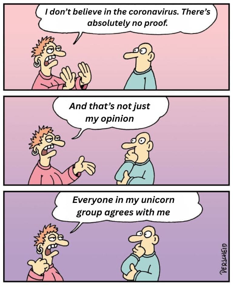 In a three-panel strip, a man denies the existence of COVID-19, claiming there’s “no proof,” and supports it by citing his unicorn group. It’s a razor-sharp commentary on conspiracy thinking and echo chambers. Perscheid nails how belief, when removed from logic, becomes laughable—and frightening. The unicorn reference adds just the right dose of ridiculous.