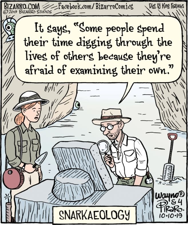 Archaeologists uncover wisdom carved in stone: diggers of dirt often avoid digging into themselves. Sharp social commentary disguised as a pun.