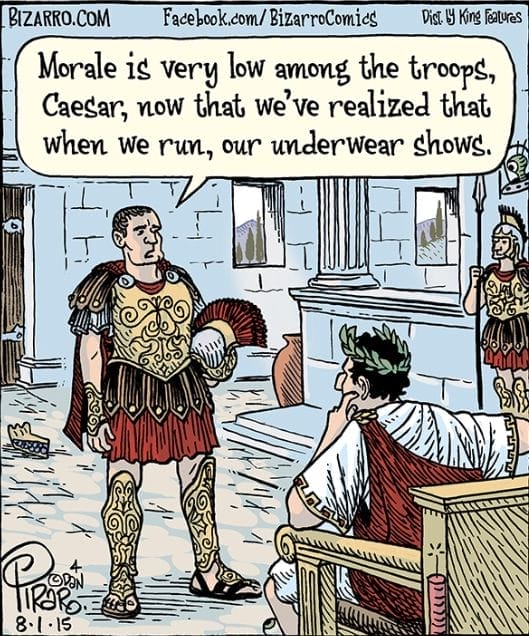 Troops lose morale after realizing their short tunics flash their underwear. Even Caesar can’t conquer self-consciousness.