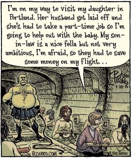 A dad explains his discount dungeon flight in brutal honesty. Nothing says low-cost airfare like rowing beside shirtless Vikings.