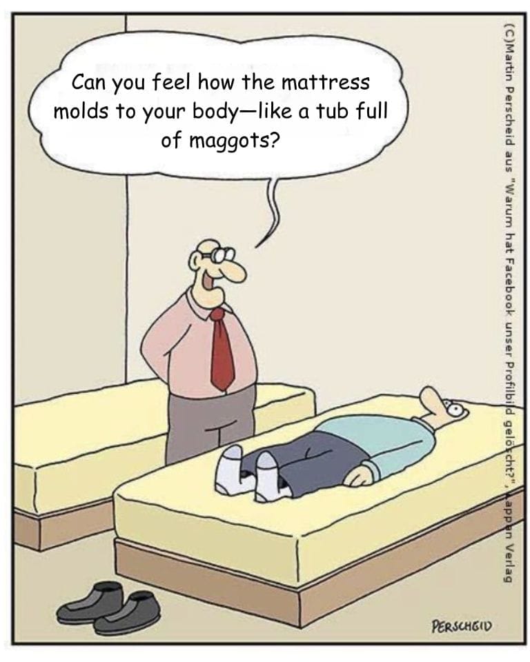 If you ever wanted to ruin a mattress commercial, just toss in the phrase “tub full of maggots.” This cartoon does exactly that, as a salesman pitches the mattress’s softness with a disturbingly morbid metaphor. The customer, lying still like a corpse, only adds to the weird morgue-like atmosphere. It’s hilariously grotesque—dark humor at its finest, where horror and hospitality meet awkwardly in the bedding aisle. Sleep tight… or not.